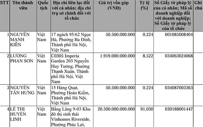 Bên cạnh bà Huyền Linh, ông Lương Phan Sơn tiếp tục giữ chức Chủ tịch Hội đồng thành viên với tỷ lệ 8,522% vốn. Ba cổ đông khác gồm ông Nguyễn Mạnh Kiên, ông Nguyễn Tân Hưng cùng sở hữu phần vốn nhỏ. Vị trí Tổng Giám đốc cũng được chuyển giao cho ông Nguyễn Diệp Anh.