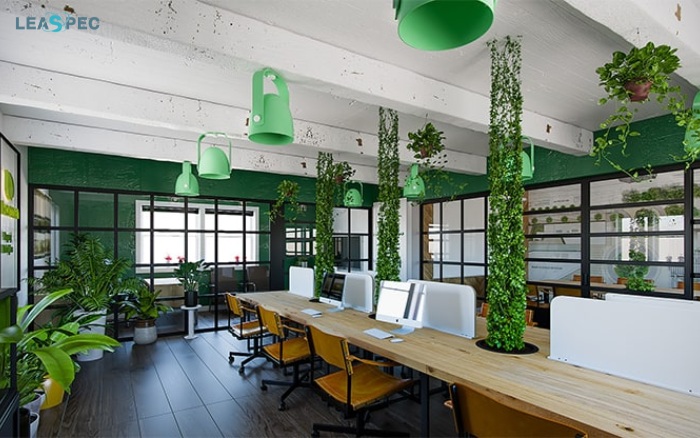 Cây xanh làm đẹp không gian, cải thiện sức khỏe tinh thần. Leaspec gợi ý sử dụng trầu bà, lưỡi hổ, dương xỉ trong văn phòng. Việc bố trí cây xanh thông minh như ở vách ngăn hoặc góc nghỉ ngơi giúp tạo điểm nhấn thương hiệu. Ngoài ra, cây xanh còn thanh lọc không khí, giảm CO2, tăng độ ẩm.